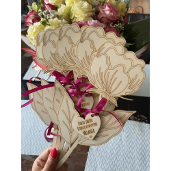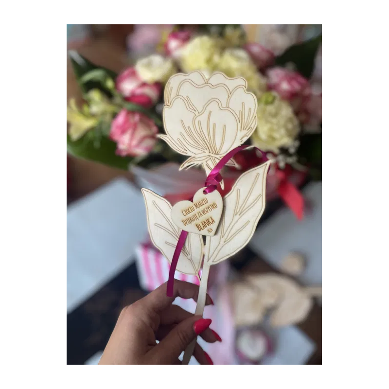 Drewniany Kwiat z grawerowaną dedykacją i wstążką w kolorze. Treść grawera do dowolnej zmiany. Krótki grawer jak na zdjęciu w cenie produktu. Kwiat jest wykonany ze sklejki. Twoja dowolna personalizacja.