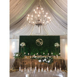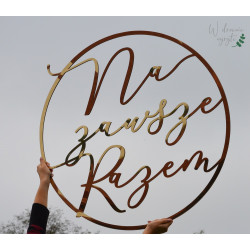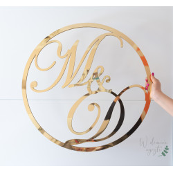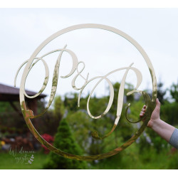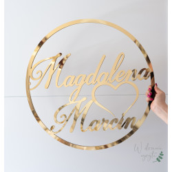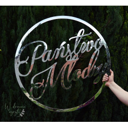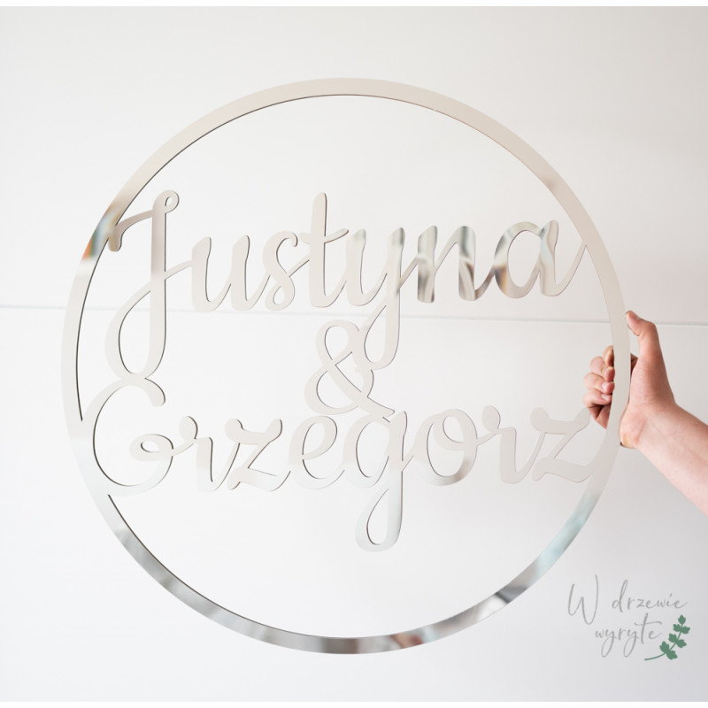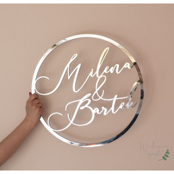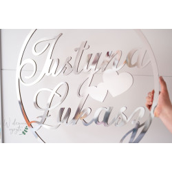 Dekoracja w formie lustrzanego koła z napisem składająca się z maksymalnie dwóch wyrazów (np. imiona) oraz łącznika (serce, & lub inne). Idealna dekoracja do ozdobienia ścianki za stołem prezydialnym.
