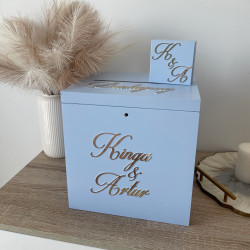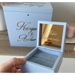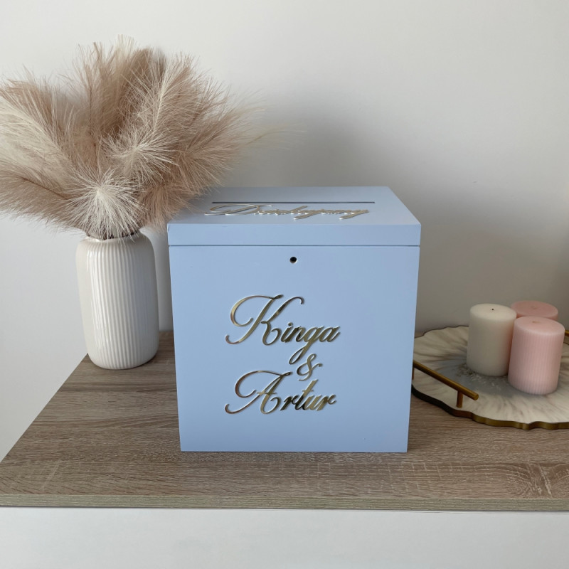 Pudełko na koperty z napisem lustrzanym dostępne jest w dwóch wymiarach. Wykonane jest z drzewa sosnowego. Istnieje możliwość wykonania napisu z lustrzanego materiału na wieku pudełka (góra) oraz na froncie pudełka (przód). Produkt może posiadać również wplecioną dowolną grafikę (informacja w uwagach) oraz wstążkę w kolorze lub koronkę.