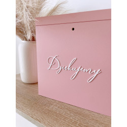 Pudełko na koperty z napisem dostępne jest w dwóch wymiarach. Wykonane jest z drzewa sosnowego. Istnieje możliwość wykonania napisu z białego materiału na wieku pudełka (góra) oraz na froncie pudełka (przód). Produkt może posiadać również wplecioną dowolną grafikę (informacja w uwagach) oraz wstążkę w kolorze lub koronkę.