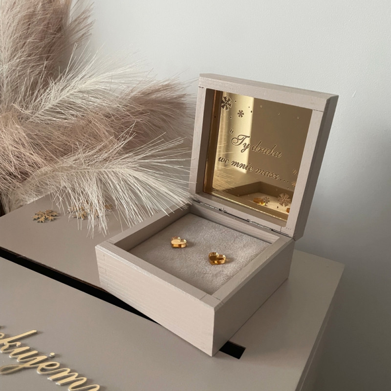 Pudełko na obrączki o wymiarach 10x10cm. Na wieczku pudełka może znajdować się napis 2 wyrazów, dekor lub inicjały. W środku pudełka (po wewnętrznej stronie wieka jest lustrzane wypełnienie z dowonym grawrem (nawet długą sentecją, Wasze imiona oraz data). Jeżeli mają Państwo swój pomysł na to pudełeczko zapraszamy do kontaktu. Wypełnienie miejsca na obrączki materiałem lub lustrem dodatkowo płatne w dodatkowych opcjach "WYPEŁNIENIE" Istnieje możliwość modyfikacji wypełnienia.