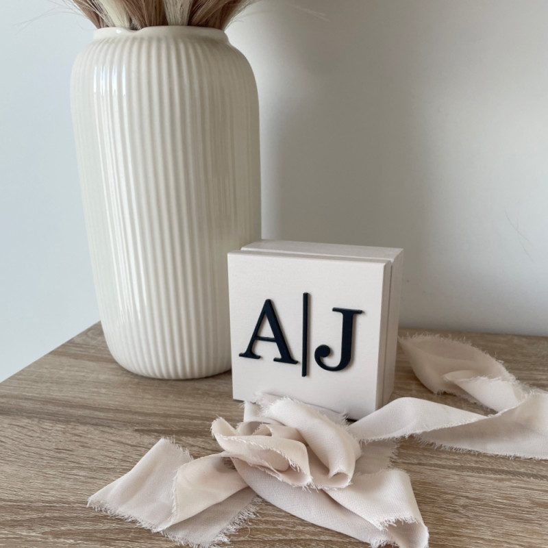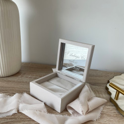 Pudełko na obrączki o wymiarach 10x10cm. Na wieczku pudełka może znajdować się napis 2 wyrazów, dekor lub inicjały. W środku pudełka (po wewnętrznej stronie wieka jest lustrzane wypełnienie z dowonym grawrem (nawet długą sentecją, Wasze imiona oraz data). Jeżeli mają Państwo swój pomysł na to pudełeczko zapraszamy do kontaktu. Wypełnienie miejsca na obrączki materiałem lub lustrem dodatkowo płatne w dodatkowych opcjach "WYPEŁNIENIE" Istnieje możliwość modyfikacji wypełnienia.
