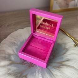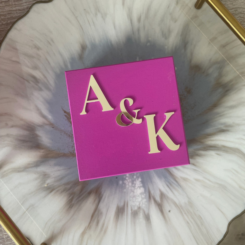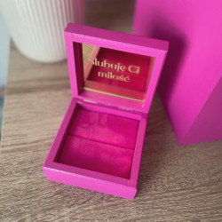 Pudełko na obrączki o wymiarach 10x10cm. Na wieczku pudełka może znajdować się napis 2 wyrazów, dekor lub inicjały. W środku pudełka (po wewnętrznej stronie wieka jest lustrzane wypełnienie z dowonym grawrem (nawet długą sentecją, Wasze imiona oraz data). Jeżeli mają Państwo swój pomysł na to pudełeczko zapraszamy do kontaktu. Wypełnienie miejsca na obrączki materiałem lub lustrem dodatkowo płatne w dodatkowych opcjach "WYPEŁNIENIE" Istnieje możliwość modyfikacji wypełnienia.