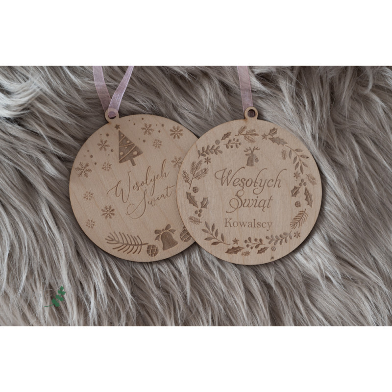 Bombka może mieć napis Moje pierwsze święta (imię) lub Nasze pierwsze święta (Nazwisko) lub Wesołych Świąt (napis) lub całkowita zmiana tekstu za dopłatą. Można wybrać z 6ciu dostępnych wzorów.