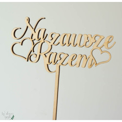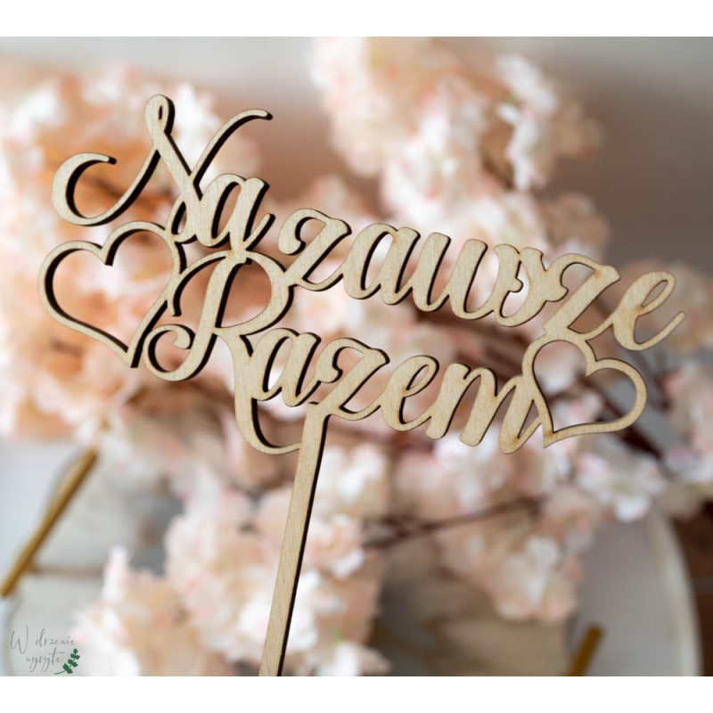 Topper na tort z wybranym napisem Na zawsze Razem z serduszkami Brak możliwości zmiany czcionki. Jeżeli chcesz swój napis wybierz inny projekt Produkt wykonany jest ze sklejki brzozowej 5mm, dzięki czemu jest bardzo trwały. Istnieje możliwość pomalowania na dowolnie wybrany kolor.