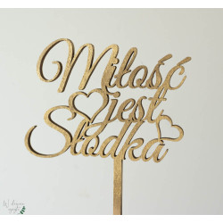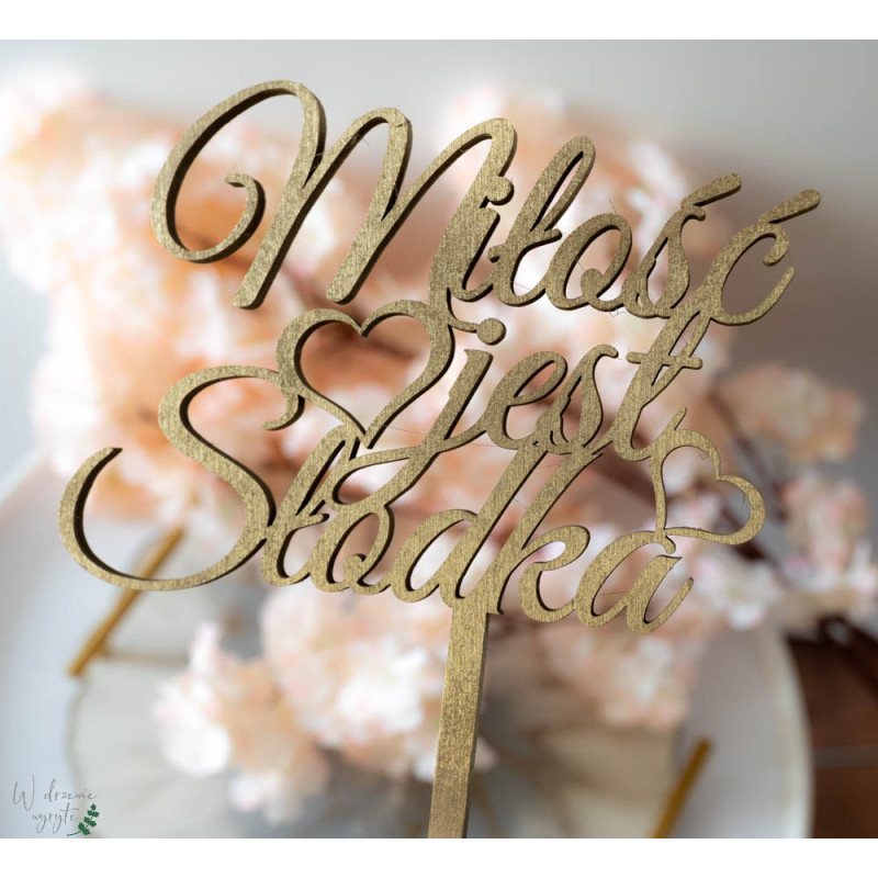 Topper na tort z wybranym napisem Miłość jest Słodka z serduszkami. Brak możliwości zmiany czcionki. Jeżeli chcesz swój napis wybierz inny projekt Produkt wykonany jest ze sklejki brzozowej 5mm, dzięki czemu jest bardzo trwały. Istnieje możliwość pomalowania na dowolnie wybrany kolor.