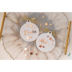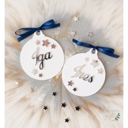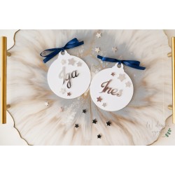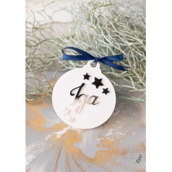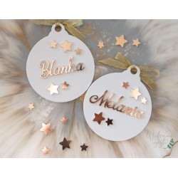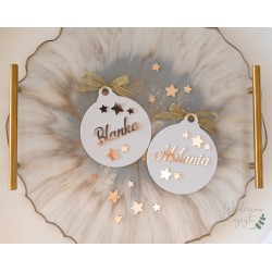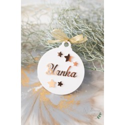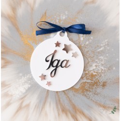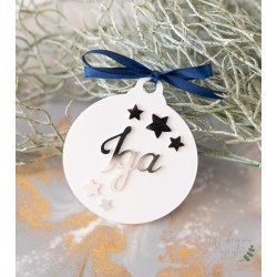 Bombka jest w kolorze białym (dwustronna przód w połysku, tył matowa biel). Imię na bombce jest dowolne. Ułożenie gwiazdek może być inne niż na zdjęciu , gdyż są naklejane ręcznie. Gwiazki i imiona są do wyboru w kolorze srebrnym lub złotym i są to napisy 3D. Wstążka złota lub srebrna (możliwy inny kolor czerwony,granatowy, ciemno zielony - wpisz w uwagach). Bombka ze wstążką ma ok. 8 cm i jest pakowana w celafon. Gotowa do podarowania.
