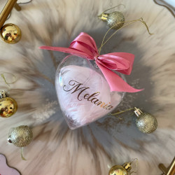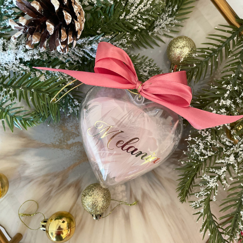 Akrylowa bombka wypełniona piórami do wyboru pióra w kolorze: białym, jasnoróżowym, ciemnozielonym.