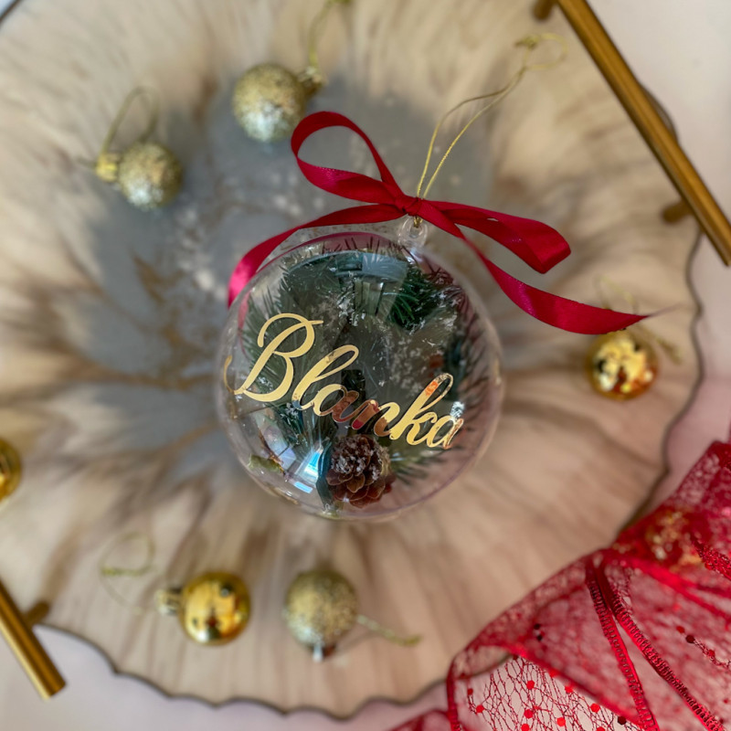 Akrylowa bombka wypełniona kompozycją świąteczną: gałązki z sztucznym śniegiem i szyszkami