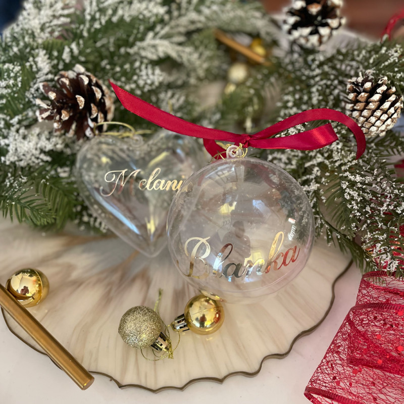 Akrylowa bombka z imieniem. Można ją powiesić w takiej wersji lub samemu wypełnić, lub podarować z prezentem świątecznym.
