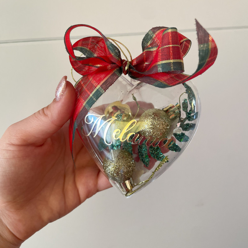 Akrylowa bombka z imieniem z kompozycją w środku w różnych kolorach mini bombek: złotych, srebrnych, czerwonych, brokatowych liści, gwiazdek itp.