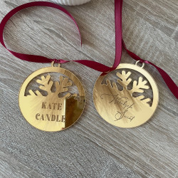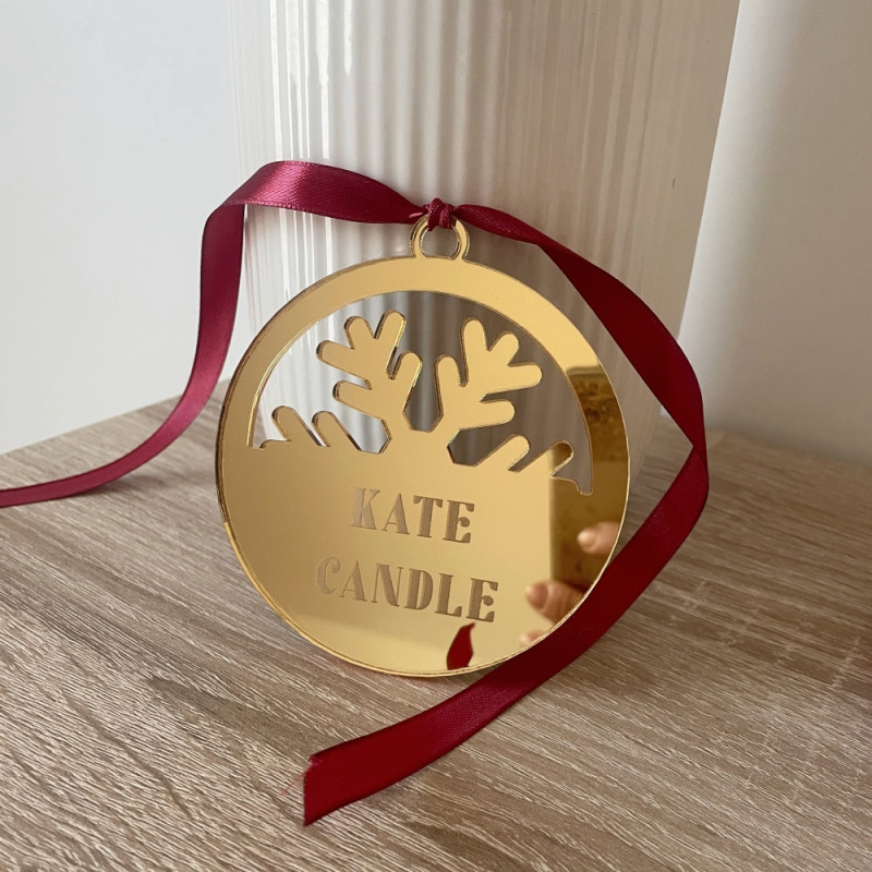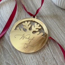 Lustrzana akrylowa bombka z grafiką w kształcie śnieżki. Wyjątkowa i piękna dekoracja z twoim napisem lub logo. Krótkie życzenia dla twoich klientów z logo firmy. Lustro złote, srebrne lub różowe.