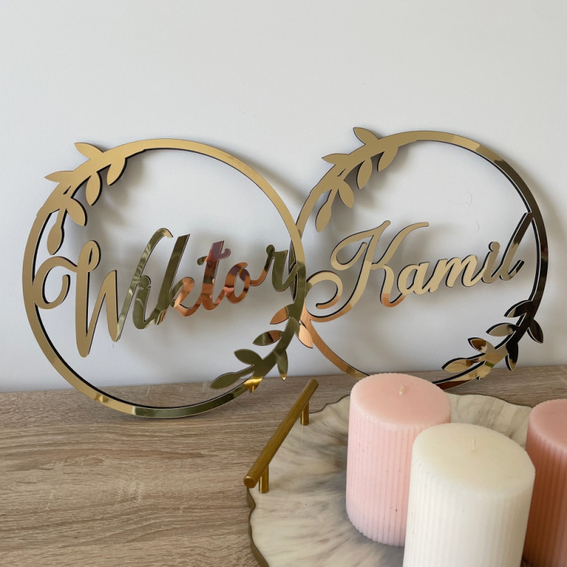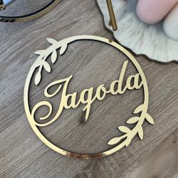 Lustrzane imię w kole z listkami idealnie sprawdzi się jako dekoracja na urodziny, chrzciny czy Komunie.