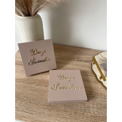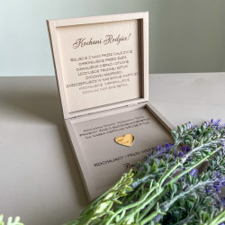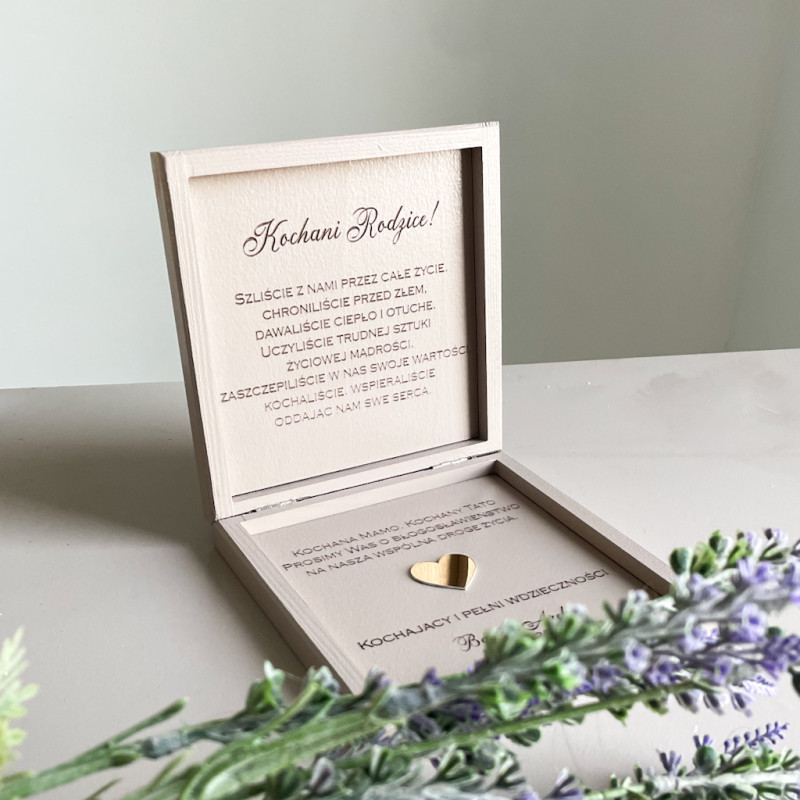 Pudełko ma wymiar 14,4x14,5 cm, malowane na wybrany kolor. Na wieku napis w kolorze lustra (srebrny/złoty) wewnątrz grawer naturalny z indywidualnym podpisem oraz lustrzane serce. Treść może zostać zmodyfikowana.