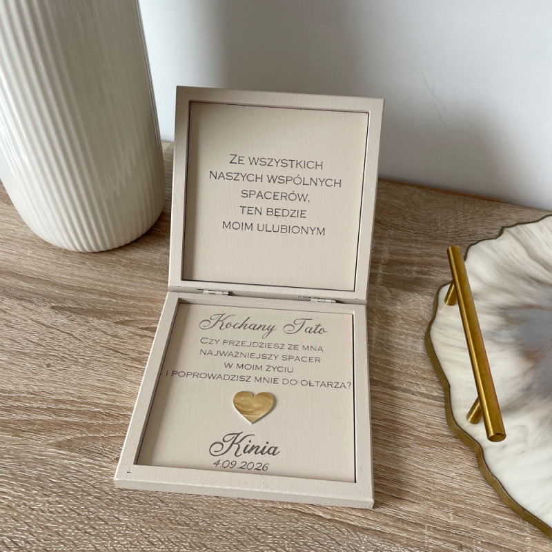 Pudełko ma wymiar 14,4x14,5 cm, malowane na wybrany kolor. Na wieku napis w kolorze lustra (srebrny/złoty) wewnątrz grawer naturalny z indywidualnym podpisem oraz lustrzane serce. Treść może zostać zmodyfikowana.